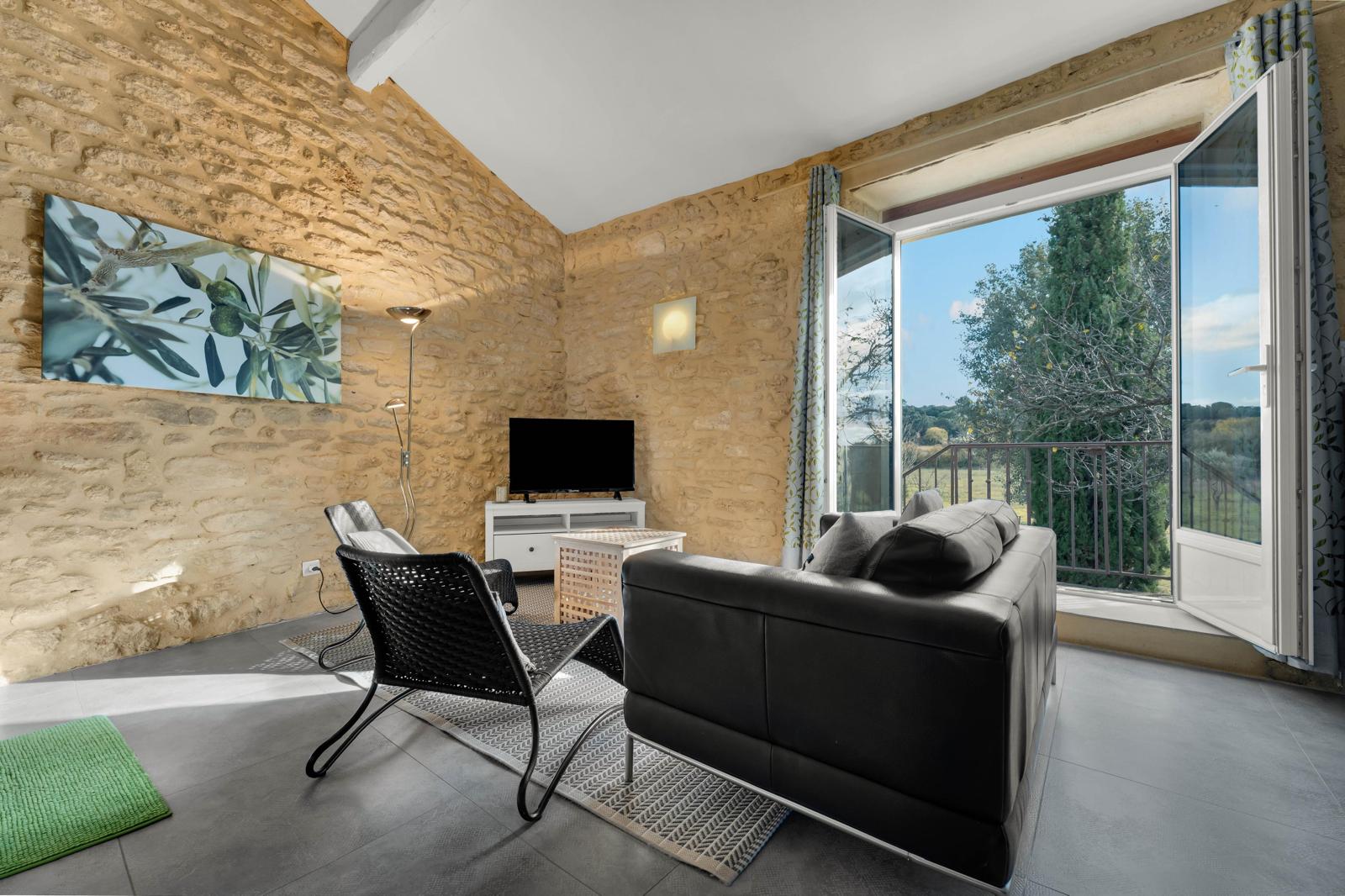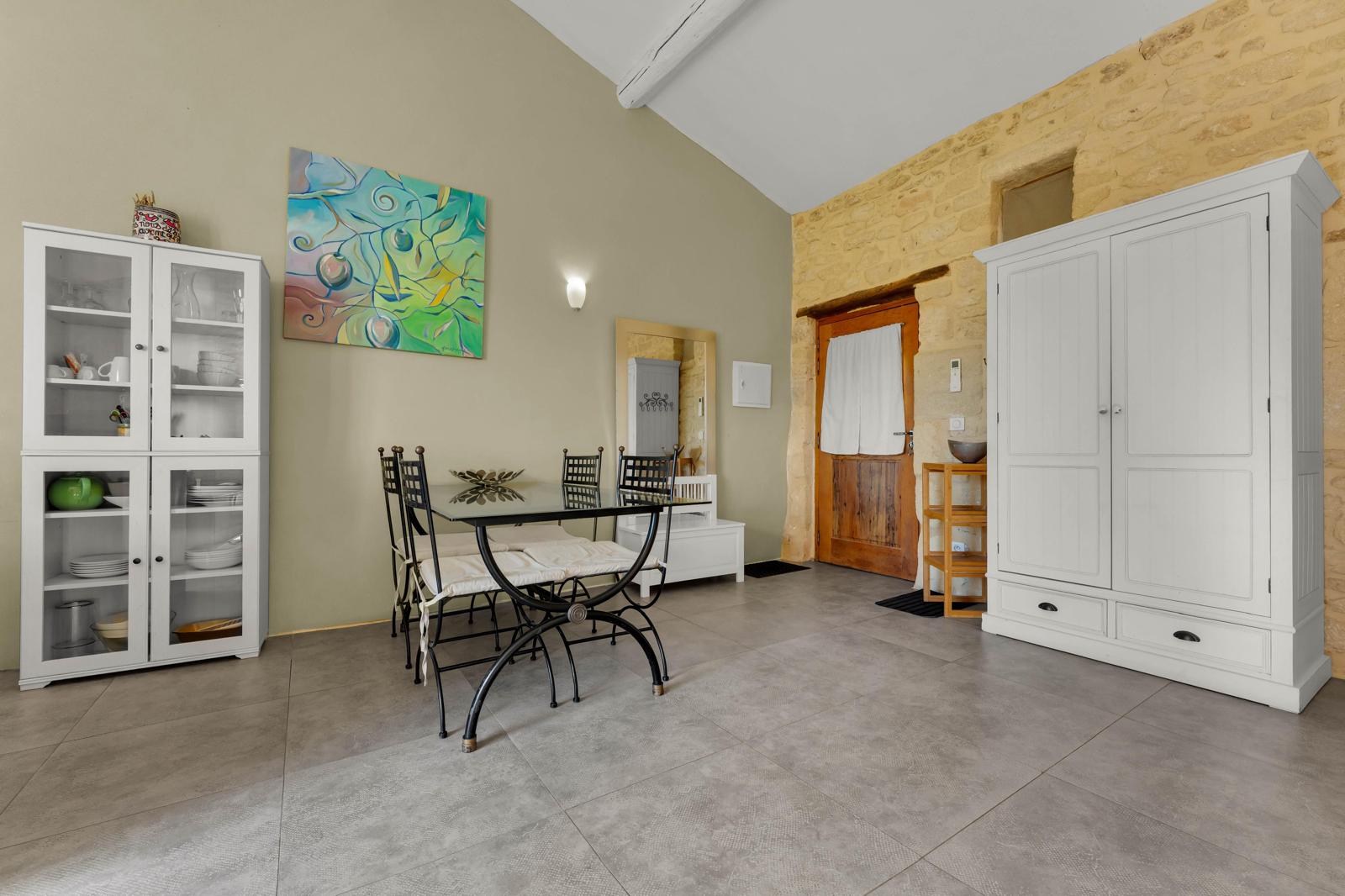 The spacious living room, approximately 40 m², features a lounge/TV area, a fully equipped kitchen, a dining area, and a large double bed. French doors face east and open onto a terrace and a small private garden (200 m²). The separate bedroom has two single beds (which can be made into a double), wooden floors, and windows overlooking the inner courtyard of our Provençal farmhouse, creating a peaceful and tranquil atmosphere. The bathroom includes a shower and toilet.